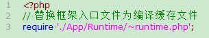接下来要展示一个新版编译缓存的新特性,假如我们之前已经生成了App/Runtime/~runtime.php编译缓存文件,现在我们进行入口文件替换,修改入口文件如下: