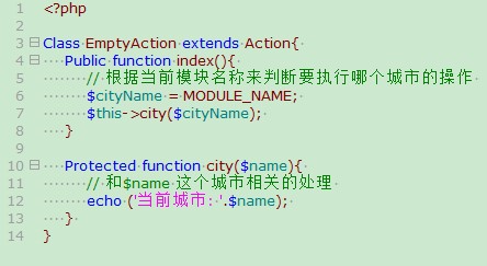 这样更加简单的方式,如果按照传统的模式,我们必须给每个城市定义一个Action类,然后在每个Action类的index方法里面进行处理。 可是如果使用空模块功能,这个问题就可以迎刃而解了。 我们可以给项目定义一个EmptyAction类