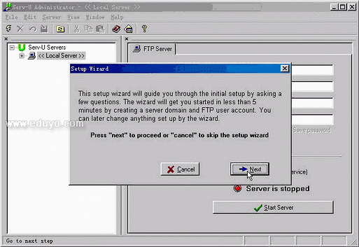 当安装完成后,系统将自动进入Serv-U Administrator(以下简称"管理器")的窗口,同时出现Setup Wizard(安装向导),此时就可以根据这个向导开始建立你的第一个FTP服务器了。(如图1)