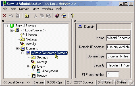 当配置完成后,即可以在管理器左边框架的Domains(域名)下看到有个Wizard Generated Domain项,其下的Users(用户)中就包含了一个名为Anonymous的账户,此账户登录后的虚拟根目录(主目录)即为D:\wy目录。(如图所示)