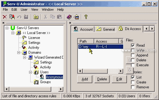 3. 基本权限修改。在管理器左边框架中选中用户名,再在右边框架中进入Dir Access(目录存取)窗口,然后在列表中选中相应目录后,就可以在窗口的右侧更改当前用户对其的访问权限了。如下图所示: