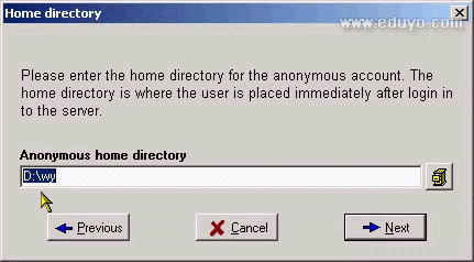 1. 当进行到有Anonymous home directory(匿名用户的主目录)提示的一步时,单击其右侧的箱子图标选择好目标目录D:\wy后再按Next(下一步)按钮继续。(如图所示)