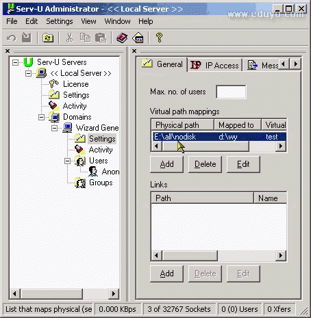 比如匿名用户(Anonymous)的主目录为D:\wy,想要能通过ftp://192.168.0.1/test的格式能访问到在E:\all\nodisk中的内容,则需要为它添加虚拟目录。操作步骤如下: