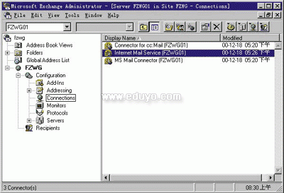 安装成功后,在管理界面中,通过双击左窗口中的"Connections"图标,就可以在右窗口中看到新安装的Internet Mail Service,如图2所示。