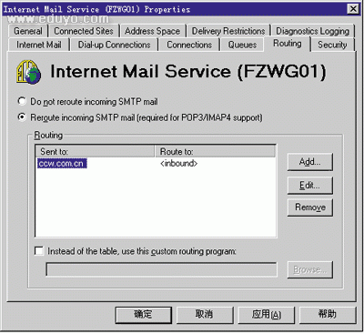 Routing属性是一个非常重要的属性。首先选择"Reroute incoming SMTP mail",然后在"Routing"中添加一条记录,"Sent to"为"mail.zzu.edu.cn","Route to"为""。通过这样的设置,才能正确接收到发送给"mail.zzu.edu.cn"的邮件,然后由IMS负责转给相应的邮箱,如图4所示。