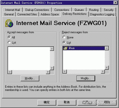 在这个属性框中,我们可以对邮件的发送和接收进行一些限制,比如不允许某些用户发送邮件或是拒绝接收某些用户发来的邮件等等。在图5中我们可以看到,系统将拒绝来自账户bbb、hami和zp的邮件。