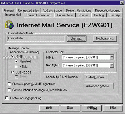 在这个属性框中,包含一些有关Internet Mail的基本属性配置,比如管理员邮箱和MIME编码字符集等等,在国内的中文应用环境中,我们可以将MIME编码字符集选择为"Chinese Simplified(GB2312)",如图3所示。