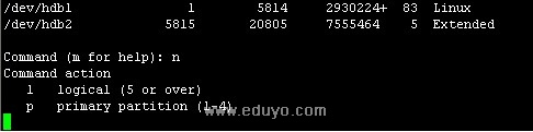 此处就开始划分扩展分区hdb2下的逻辑分区吧!接着上图,输入命令n回车