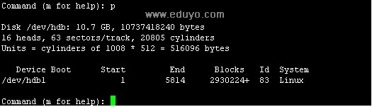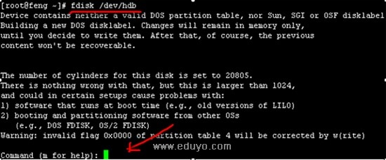 输入 fdisk /dev/hdb 然后回车,给硬盘进行分区。如下图