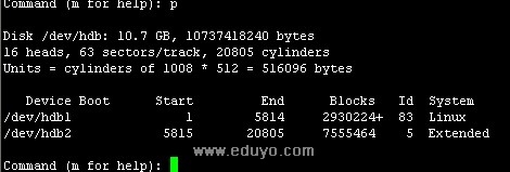 linux分区不同于windows,linux下硬盘设备名为(IDE硬盘为hdx(x为从a—d)因为IDE硬盘最多四个,SCSI,SATA,USB硬盘为sdx(x为a—z)),硬盘主分区最多为4个,不用说大家也知道…..所以主分区从sdb1开始到sdb4,逻辑分区从sdb5开始,(逻辑分区永远从sdb5开始…)设备名可以使用fdisk –l查看