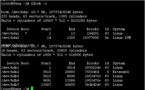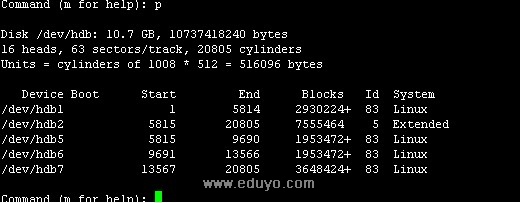 再次使用fdisk -l命令就可以查看到磁盘hdb已经分区成功。