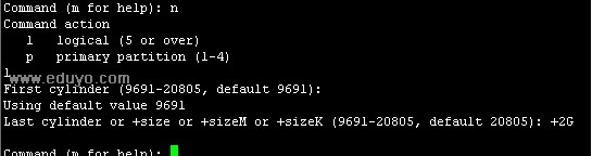 此处要按计划再划分出两个逻辑空间,输入n回车,然后输入l回车选择逻辑分区,然后直接回车选择默认起始柱面,输入+2G回车设置分区大小
