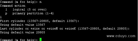 下面就要将扩展分区的磁盘大小全部分给最后一个逻辑分区,输入n回车,然后输入l选择逻辑分区,然后直接回车选择默认起始柱面,最后不设置磁盘大小直接回车
