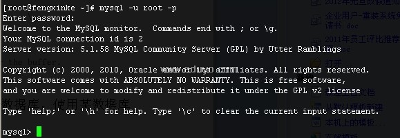 3、使用命令 mysql -u root -p 命令,然后输入root密码 登录数据库