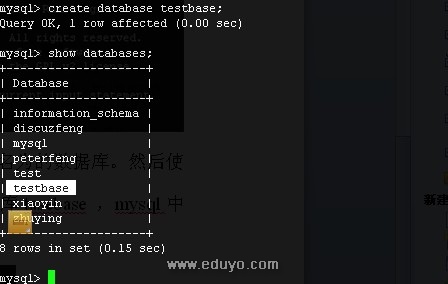 4、使用create database testbase;命令创建一个名为的数据库。然后使用命令show databases;可以查看创建的数据库tasebase ,mysql中的命令后面都要以分号结束