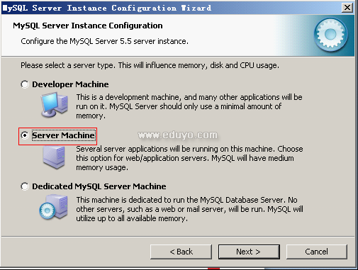 9.这个选项是选择mysql应用于何种类型,第一种是开发服务器,将占用尽量少的内存,第二种是普通web服务器,将占用中等数量内存,最后一种是这台服务器上面只跑mysql数据库,将占用全部的内存,这里选择第二项,你可根据自己的需求,选择其它选项.