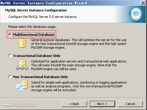 10.这里是选择数据库用途,第一种是多功能用途,将把数据库优化成很好的InnoDB存储类型和高效率的MyISAM存储类型,第二种是只用于事务处理类型,最好的优化InnoDB,但同时也支持MyISAM,最后一种是非事务处理类型,适合于简单的应用,只有不支持事务处理的MyISAM类型是被支持的。所以这里我们选择第一种