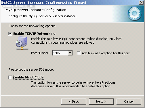 将端口设置后面的“Add firewall exception for this port”勾选中,如果你开启了Windows防火墙,将自动把这里设置的端口(3306)排除在外(允许连接网络)(如果你没有开启Windows防火墙这里就不要勾选,Windows server 2003 正版默认是没有开启的)。