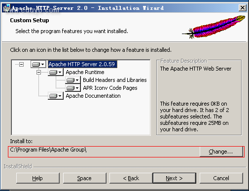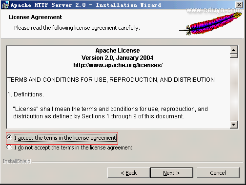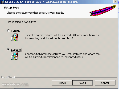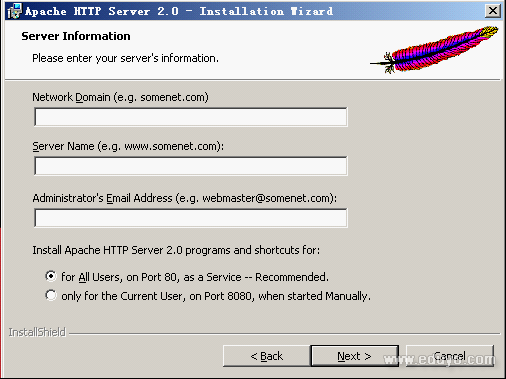 4.设置系统信息,在Network Domain下填入您的域名,在Server Name下填入您的服务器名称,在Administrator's Email Address下填入系统管理员的联系电子邮件地址。下面有两个选择,图片上选择的是为系统所有用户安装,使用默认的80端口,并作为系统服务自动启动;另外一个是仅为当前用户安装,使用端口8080,手动启动。一般选择如图所示。按“Next”继续