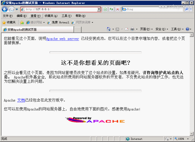 9.接下来我们测试下按默认配置运行的网站界面,在IE地址栏打“127.0.0.1”,“回车”,就可以看到如下页面,表示Apache服务器已安装成功。