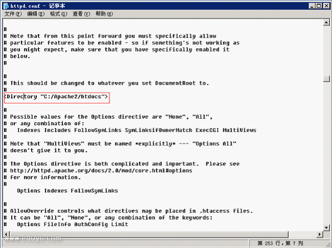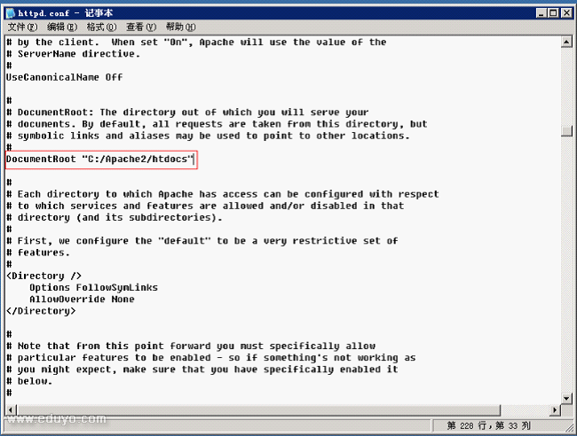 11.正式开始配置Apache服务器,“ 228行”,或者查找关键字“DocumentRoot”(也就是网站根目录),找到如下图所示地方,然后将""内的地址改成你的网站根目录,地址格式请照图上的写.