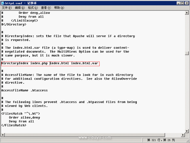 13. 321行”,DirectoryIndex(目录索引,也就是在仅指定目录的情况下,默认显示的文件名),可以添加很多,系统会根据从左至右的顺序来优先显示,以单个半角空格隔开,比如有些网站的首页是index.htm,就在光标那里加上“index.htm ”文件名是任意的,不一定非得“index.html”,比如“test.php”等,都可以。