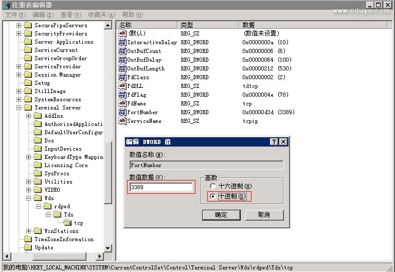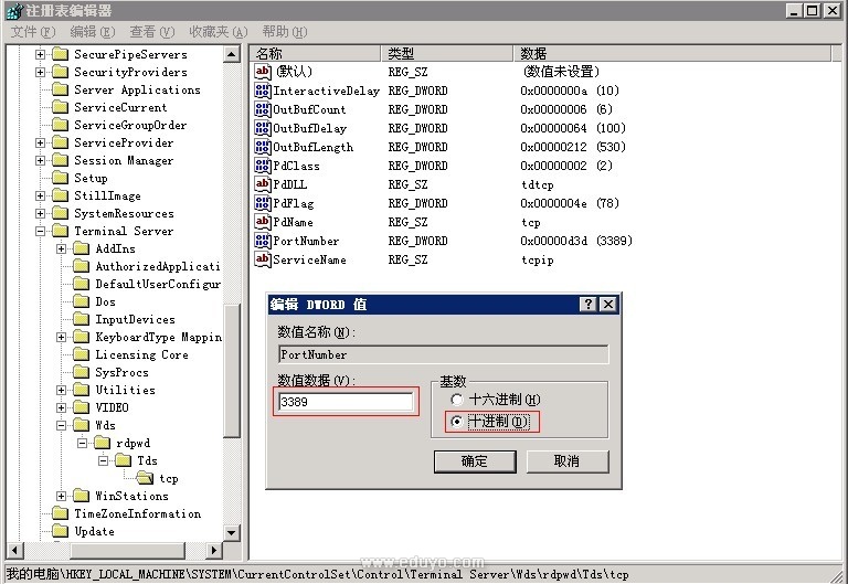 HKEY_LOCAL_MACHINE\System\CurrentControlSet\Control\Terminal Server\WinStations\RDP-Tcp 如图修改为您自己需要的端口建议修改到1万以上的端口号