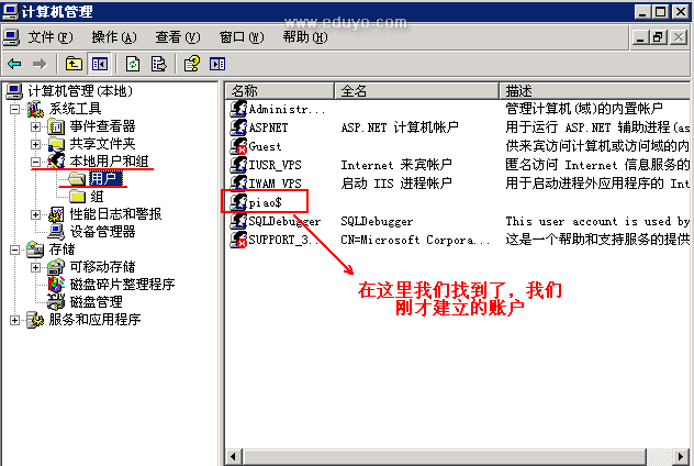 我们来看看隐藏账户的建立是否成功。在“命令提示符”中输入查看系统账户的命令“net user”,回车后会显示当前系统中存在的账户。从返回的结果中我们可以看到刚才我们建立的“piao$”这个账户并不存在。接着让我们进入控制面板的“管理工具”,打开其中的“计算机”,查看其中的“本地用户和组”,在“用户”一项中,我们建立的隐藏账户“piao$”暴露无疑。