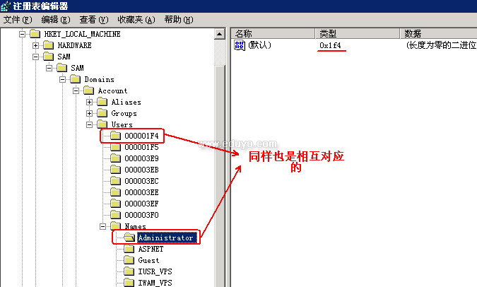 成功得到注册表操作权限后,我们就可以正式开始隐藏账户的制作了。来到注册表编辑器的“HKEY_LOCAL_MACHINE\SAM\SAM\Domains\Account\Users\Names”处,当前系统中所有存在的账户都会在这里显示,当然包括我们的隐藏账户。点击我们的隐藏账户“piao$”,在右边显示的键值中的“类型”一项显示为0x3f0,向上来到“HKEY_LOCAL_MACHINE\SAM\SAM\Domains\Account\Users\”处,可以找到“000003f0”这一项,这两者是相互对应的,隐藏账户“piao$”的所有信息都在“000003f0”这一项中。同样的,我们可以找到“administrator”账户所对应的项为“000001F4”。