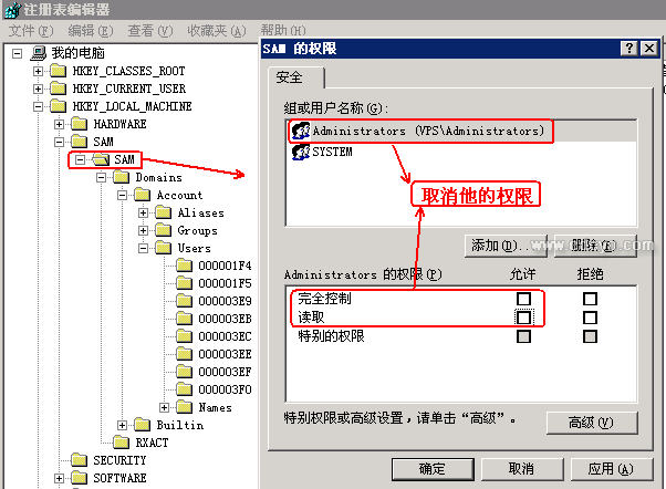 打开“regedt32.exe”,来到“HKEY_LOCAL_MACHINE\SAM\SAM”处,设置“SAM”项的权限,将“administrators”所拥有的权限全部取消即可。当真正的管理员想对“HKEY_LOCAL_MACHINE\SAM\SAM”下面的项进行操作的时候将会发生错误,而且无法通过“regedt32.exe”再次赋予权限。这样没有经验的管理员即使发现了系统中的隐藏账户,也是无可奈何的。