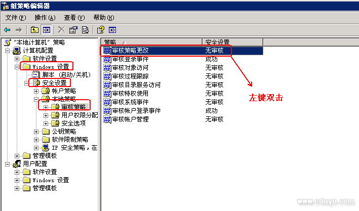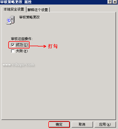 如果黑客制作了一个修改注册表型隐藏账户,在此基础上删除了管理员对注册表的操作权限。那么管理员是无法通过注册表删除隐藏账户的,甚至无法知道黑客建立的隐藏账户名称。不过世事没有绝对,我们可以借助“组策略”的帮助,让黑客无法通过隐藏账户登陆。点击“开始”→“运行”,输入“gpedit.msc”运行“组策略”,依次展开“计算机配置”→“Windows 设置”→“安全设置”→“本地策略”→“审核策略”,双击右边的“审核策略更改”,在弹出的设置窗口中勾选“成功”,然后点“确定”。对“审核登陆事件”和“审核过程追踪”进行相同的设置。