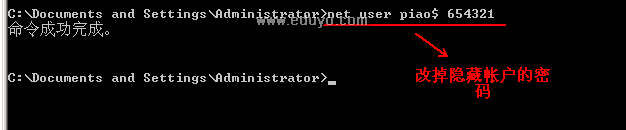 得知隐藏账户的名称后就好办了,但是我们仍然不能删除这个隐藏账户,因为我们没有权限。但是我们可以在“命令提示符”中输入“net user 隐藏账户名称 654321”更改这个隐藏账户的密码。这样这个隐藏账户就会失效,黑客无法再用这个隐藏账户登陆。
