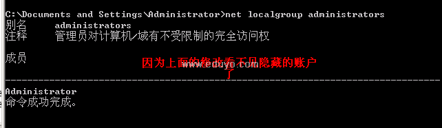 对于这类隐藏账户的检测比较简单。一般黑客在利用这种方法建立完隐藏账户后,会把隐藏账户提升为管理员权限。那么我们只需要在“命令提示符”中输入“net localgroup administrators”就可以让所有的隐藏账户现形。如果嫌麻烦,可以直接打开“计算机管理”进行查看,添加“$”符号的账户是无法在这里隐藏的。
