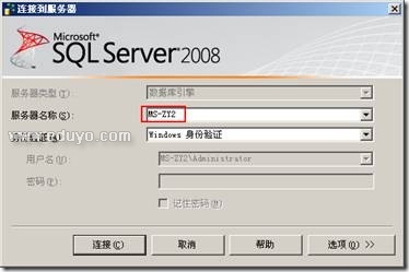 先在虚拟机SQL 2008 RC0中安装了Windows 2003操作系统,机器名为MS-ZY,然后安装SQL Server 2008,所以数据库的服务器名也就是MS-ZY。