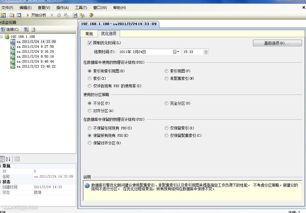 现在我们来打开数据库引擎优化顾问 我们单击开始--程序--Microsoft SQL Server 2005--性能工具--数据库引擎优化顾问