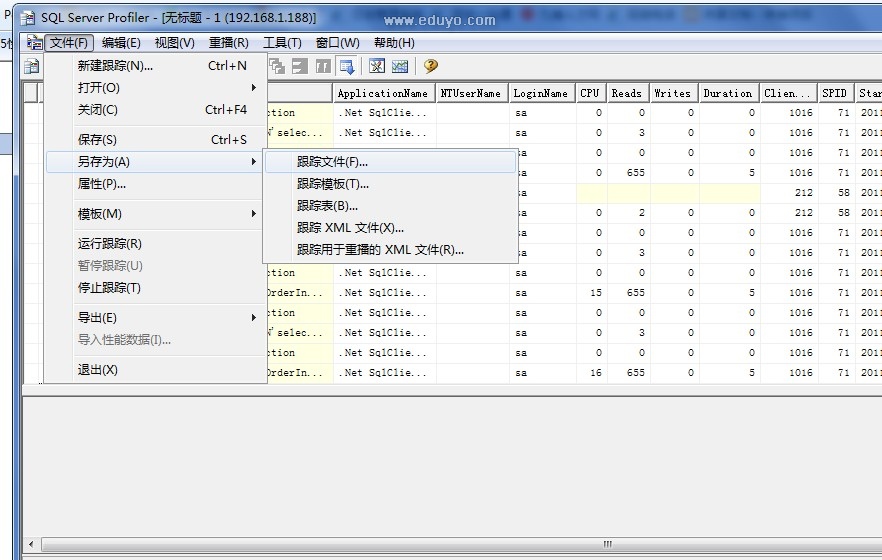 有了这个跟踪的记录我们怎么样使用数据库引擎优化顾问对其进行分析优化呢?当然第一步我们要先把跟踪到的记录导出到文件.trc类型的文件。单击文件--另存为
