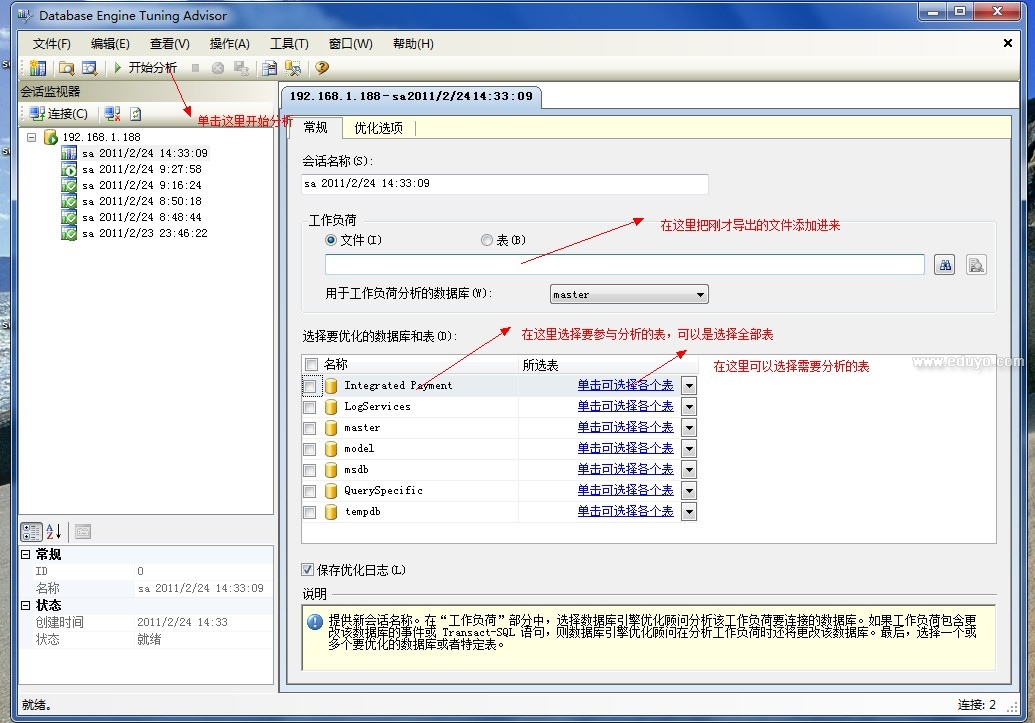 我们可以看一下界面,一般不用选择只要安默认的就OK了,需要配置的我上面都有注释。在这里大家一定要记得选择用于工作负荷的数据库和表,意思就是设置要分析的数据库否则会分析不成功。