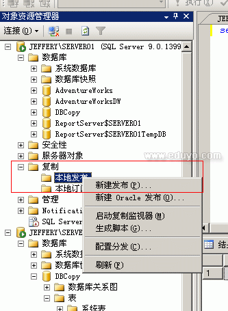 第二步:在SERVER01上设置发布和分发A 在SERVER01的复制节点—>本地发布右键选择新建订阅(图2)