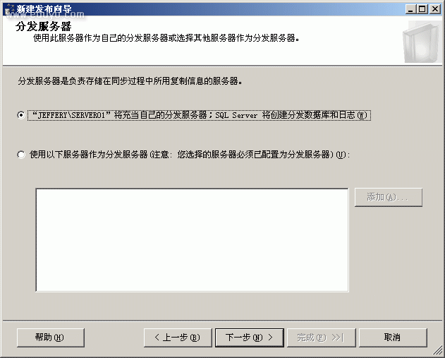 B B 在新建发布向导中首先要求选择分发服务器,本例选择本机作为分发服务器,选择默认值。(图3)