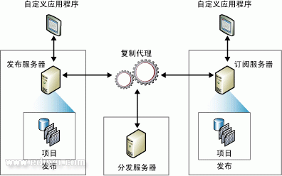 一组SQL SERVER2005复制有发布服务器、分发服务器、订阅服服务器(图1 复制服务器之间的关系图)组成,他们之间的关系类似于书报行业的报社或出版社、邮局或书店、读者之间的关系。以报纸发行为例说明,发布服务器类似于报社,报社提供报刊的内容并印刷,是数据源;分发服务器相当于邮局,他将各报社的报刊送(分发)到订户手中;订阅服务器相当于订户,从邮局那里收到报刊。在实际的复制中,发布服务器是一种数据库实例,它通过复制向其他位置提供数据,分发服务器也是一种数据库实例,它起着存储区的作用,用于复制与一个或多个发布服务器相关联的特定数据。每个发布服务器都与分发服务器上的单个数据库(称作分发数据库)相关联。分发数据库存储复制状态数据和有关发布的元数据,并且在某些情况下为从发布服务器向订阅服务器移动的数据起着排队的作用。在很多情况下,一个数据库服务器实例充当发布服务器和分发服务器两个角色。这称为“本地分发服务器”。订阅服务器是接收复制数据的数据库实例。一个订阅服务器可以从多个发布服务器和发布接收数据。