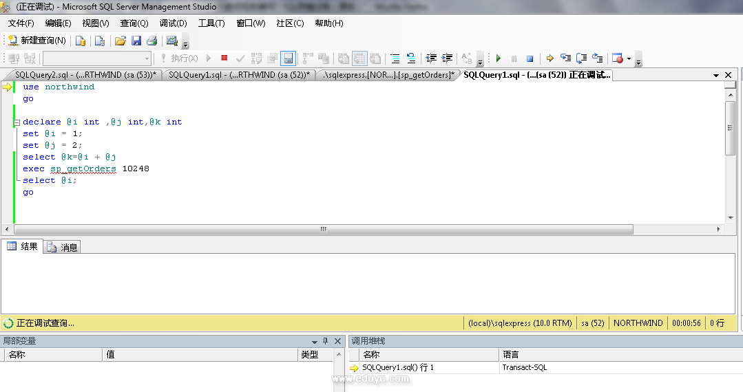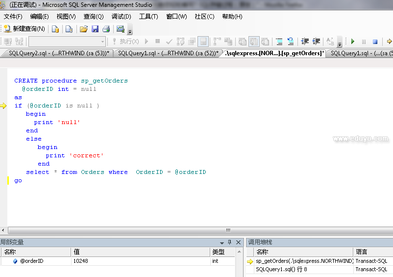 当断点经过exec sp_getOrders 10248 这段代码时,点击F11进入sp_getOrders存储过程进行逐语句debug。