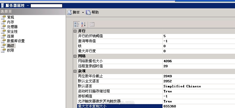 经过查找一番资料,发现服务器配置选项里有一项 "Max Text Repl Size" (“最大文本复制大小”),它的默认值为65536,可以通过修改这个值解决上面的问题。