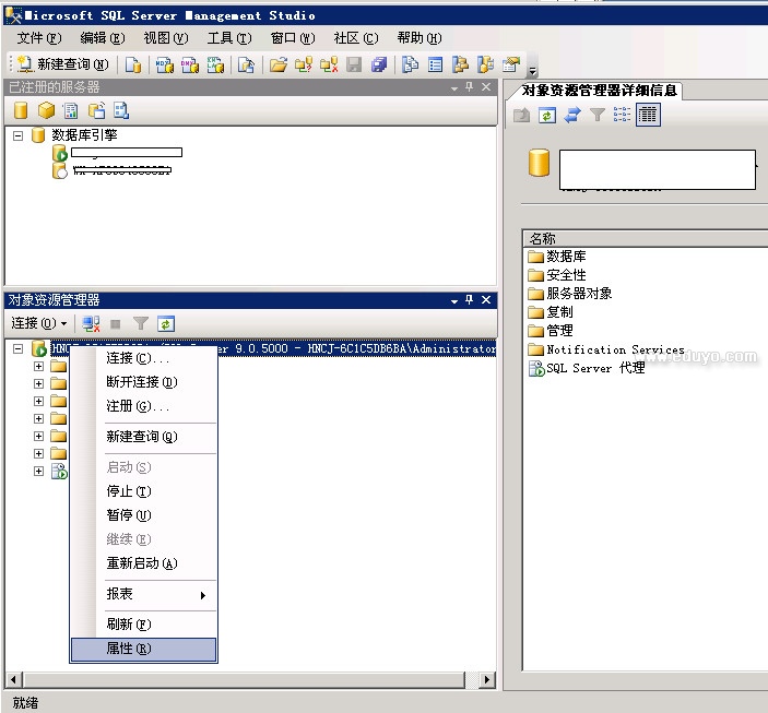 1、在对象资源管理器中,右键单击服务器并选择“属性”。
