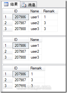 --清空所有数据 delete from UserExtent; delete from UserBase; --插入两行数据 insert Users (name,remark) values (N'user1', N'1'); insert Users (name,remark) values (N'user2', N'2'); insert Users (name,remark) values (N'user3', N'2'); --修改后两行数据 UPDATE Users set Remark = N'3' where Remark = N'2' --输出数据 select * from Users; select * from UserBase; select * from UserExtent;