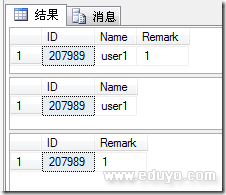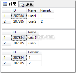 --清空所有数据 delete from UserExtent; delete from UserBase; --插入两行数据 insert Users (name,remark) values (N'user1', N'1'); insert Users (name,remark) values (N'user2', N'2'); insert Users (name,remark) values (N'user3', N'2'); --删除后两行数据 delete from Users where Remark = N'2' --输出数据 select * from Users; select * from UserBase; select * from UserExtent;