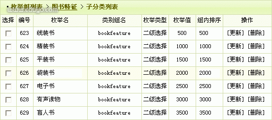 我们以创建一个“图书(book)”内容模型为例,这个模型中我们需要网站管理员(用户)提交一个图书特征的分类,我们知道以下图书特征的分类: