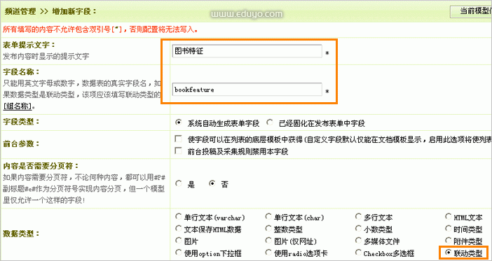 这样我们就创建完成了这个图书特征(bookfeature)的联动类型,接下来我们要应用这个联动类型,我们在新创建的模型中添加字段,在字段添加的页面中添加相应的字段名称,选择数据类型为联动类型,如下图所示: