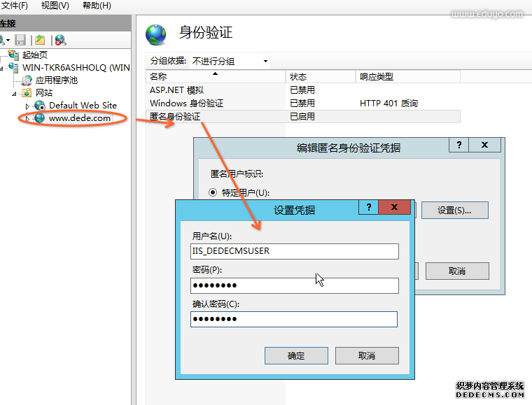 (1)首先我们在IIS中绑定设定的用户帐号,在站点的功能试图中的“身份验证”,双击进入后,在“匿名身份验证”中设定之前我们添加的用户帐号“IIS_DEDECMSUSER”(如图6.1-1);