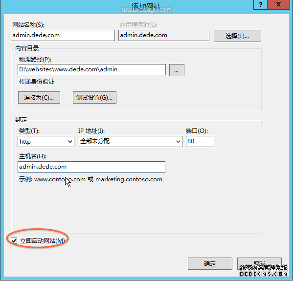 (1)创建管理后台站点,将系统更目录下的dede管理后台文件夹移动到“D:Websiteswww.dede.comadmin”中,创建一个名为“admin.dede.com”的站点(如图6.2-1);